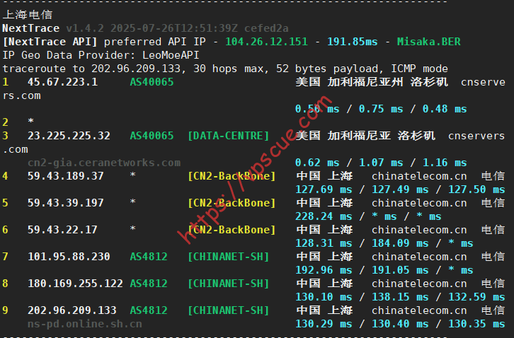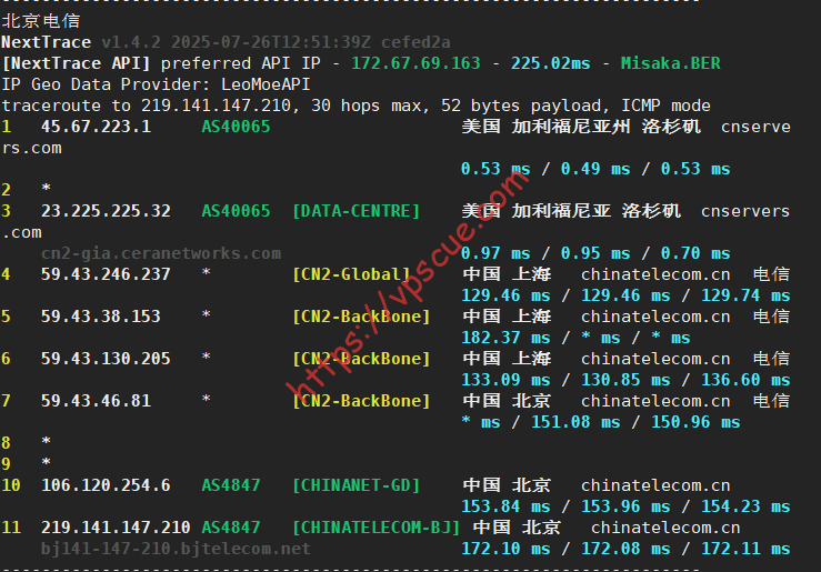北京电信走的上海CN2 GIA路由。